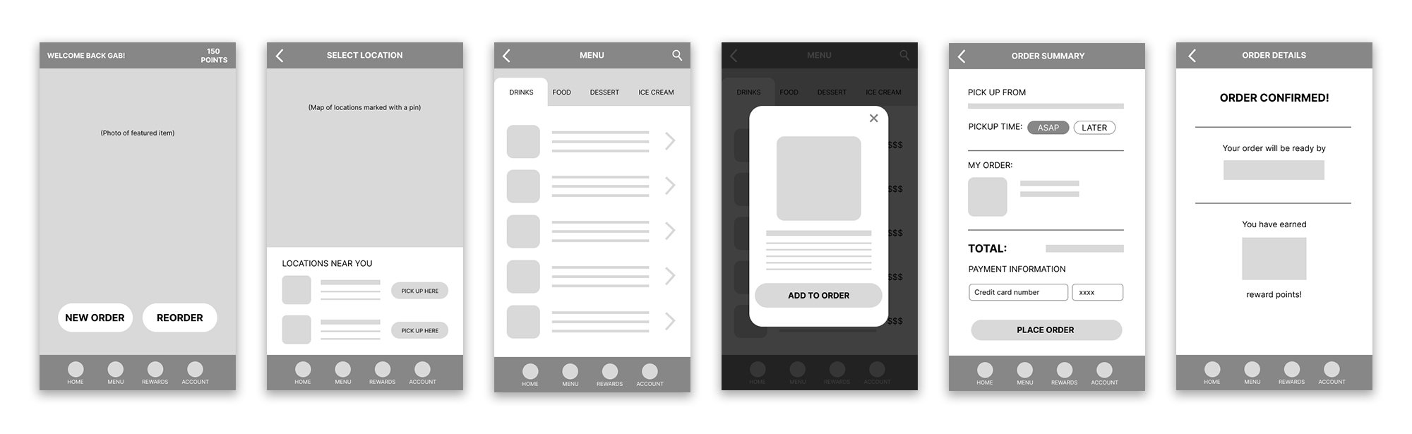 Creating different iterations of each screen of the app on paper ensured that certain elements that made it to digital wireframes would address user pain points. On the home screen I prioritized a quick and easy ordering process to help users save time.